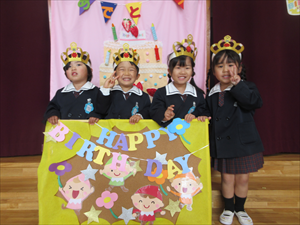 1月のお誕生会です。 バースデー写真を受け取り嬉しそうな子どもさんたち。 保育者からのおたのしみは『箱の中身はなんだろなクイズ』です。箱の中に手を入れて触り、箱の中身を当てるゲームです。今 ...