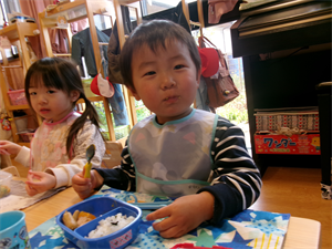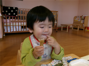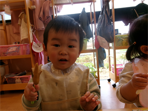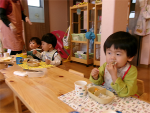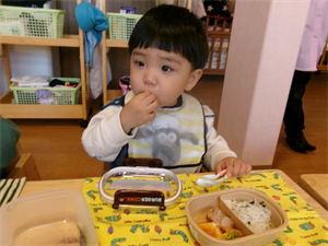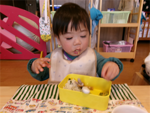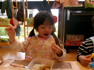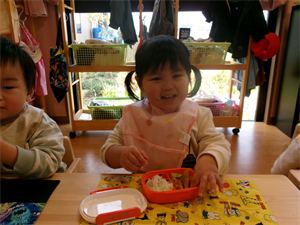 席に着いて保育者がお弁当箱の中にご飯やおかずを入れると、つい手が・・・触ってしまいます(笑)いただきますが待ちきれません・・・。