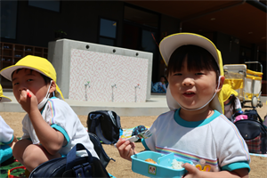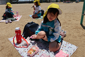 オリジナル弁当を持っていざお外へ!「〇〇ちゃんと食べたいな~」「こっちで食べよ」と楽しそうな声が聞こえました(^^♪ おひさまもぽかぽかで、とっても気持ちがよかったですよ♡みんな大満足の様子でした♪