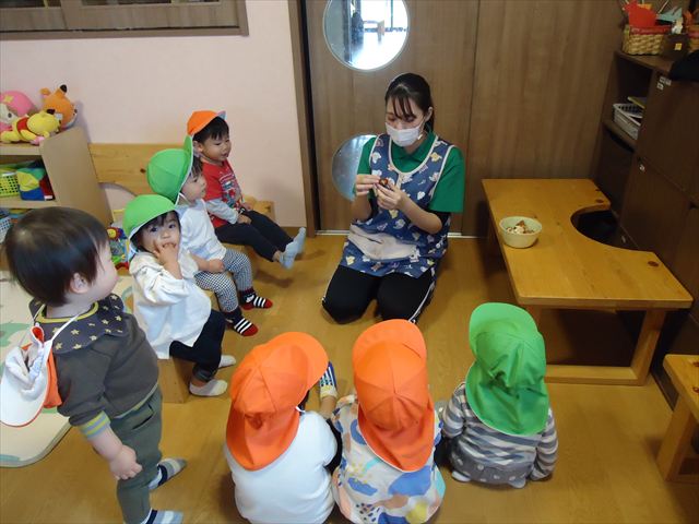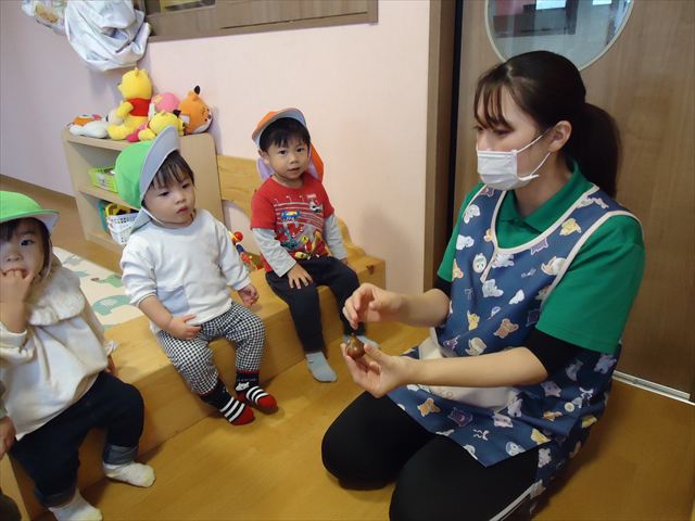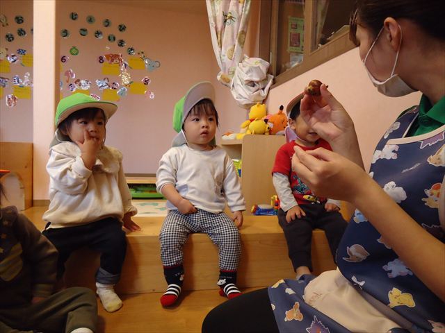 お部屋の中で「これなんだ?」見せると「たまねぎ?」「小さい玉ねぎ!」とお返事が聞こえてきました。確かに形が似ていますね(*^_^*)