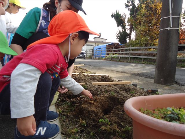 球根を持って外に出るとひまわりホームさんが一緒に行こう!と誘いに来てくれて手を繋いで一緒に花壇に行き一人ずつ植えることが出来ましたよ。