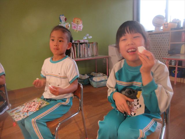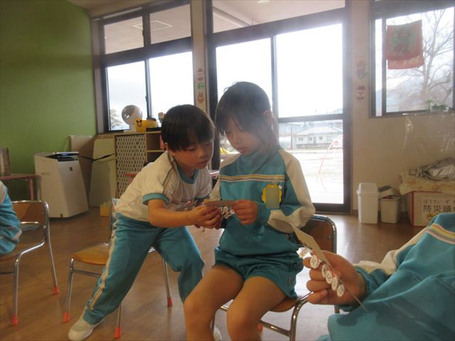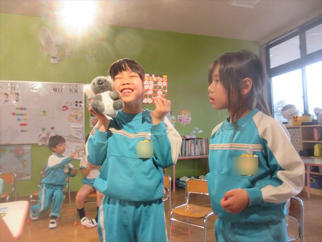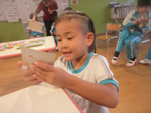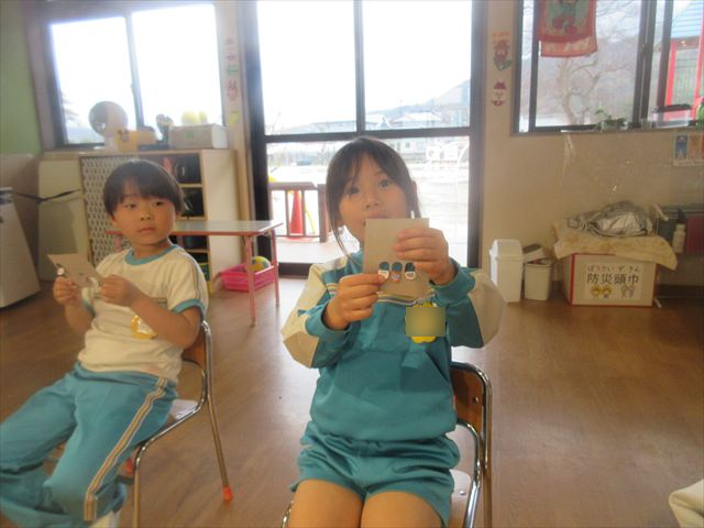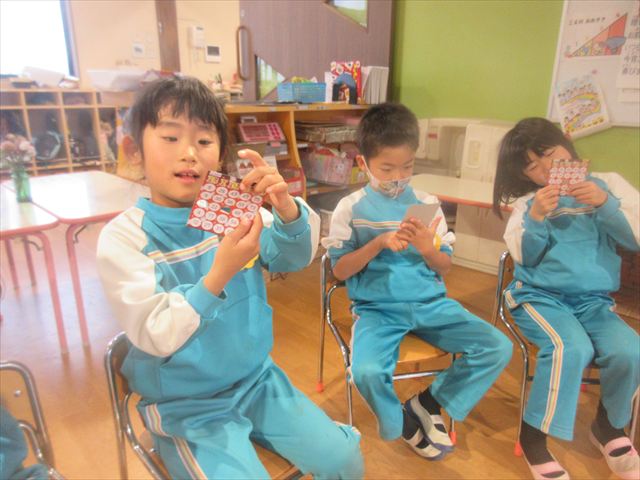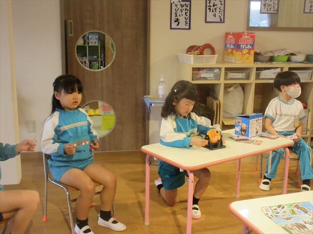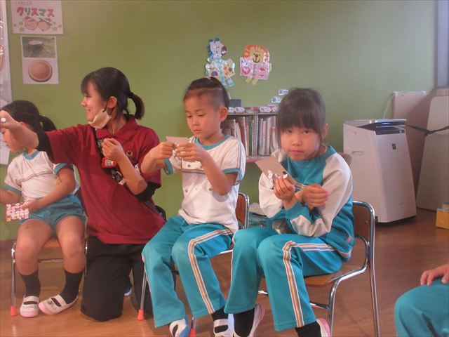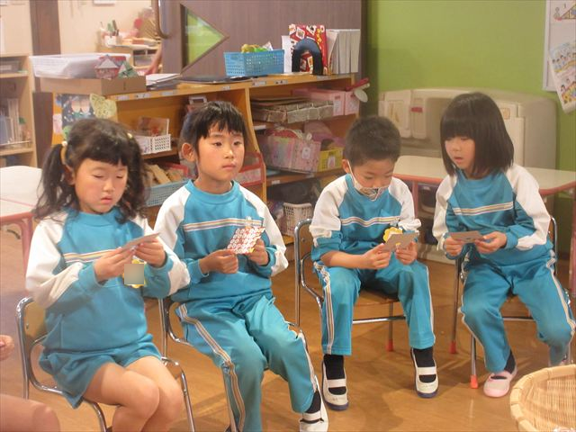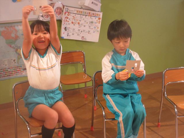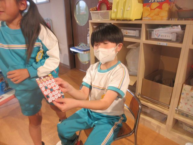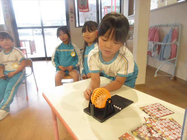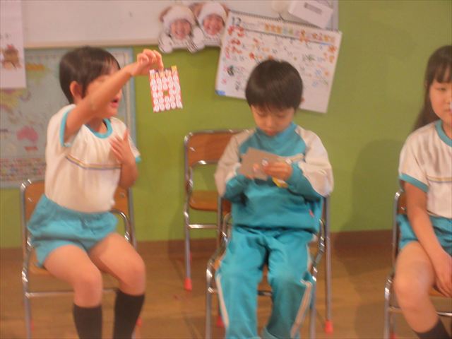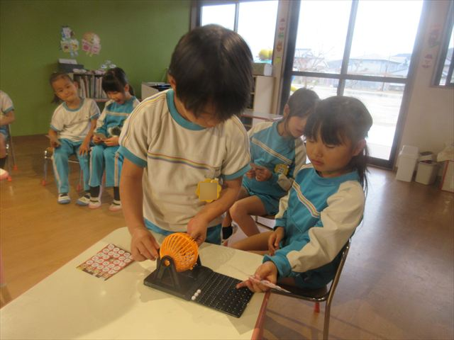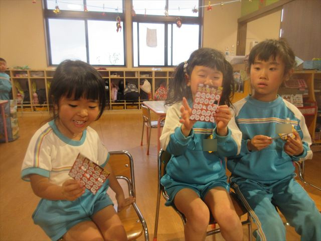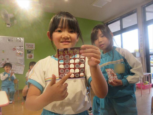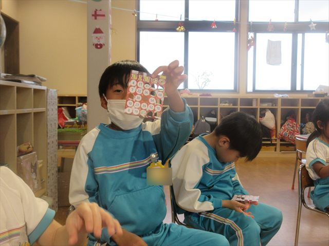 秋を探そうBINGOでは「景品はないんですか?」という子どもさんのつぶやきが心に残っていましたので、今回の年末BINGO大会では、通常の数字のカードと景品も準備しました!10を超える数字ばかり出てきましたが、子どもさん達は「62!あった」「違うよそれは、26だよ」とお友達と教え合ったり、保育者が大きく示す数字を確認しながらルールを守って楽しむ姿がありました!「4つもリーチがあるのにBINGOにならない」というお友達もいました!