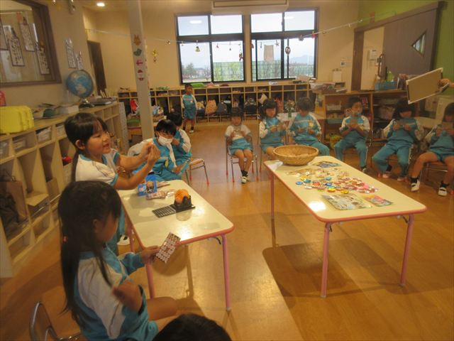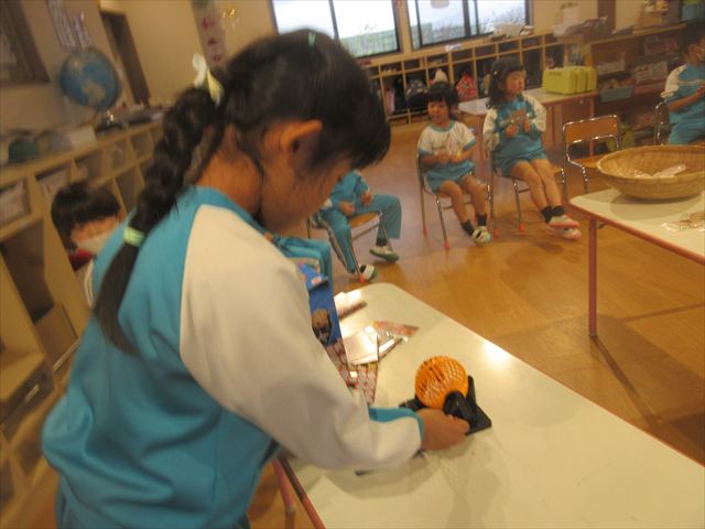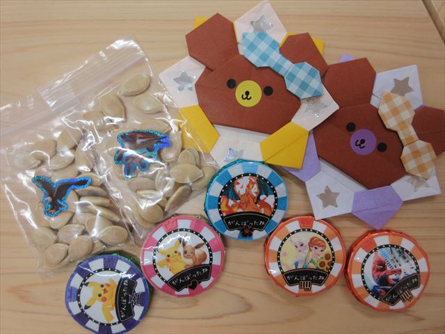 ついにBINGOになり手作りメダルや物語メニューに出てきたかぼちゃのタネをゲットし、大喜びの子どもさん!メダルとかぼちゃのタネ・・・「メダルはハッピーホラーナイトでももらったけど、かぼちゃのタネは植えたら実ができるかもしれないからやっぱりこっちにしよう!」とすご~く悩んで決めたお友達もいましたよ♪みちえ先生からもおやつのお土産もBINGOのお友達から好きなおやつを選びました(#^.^#)