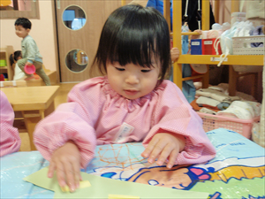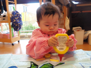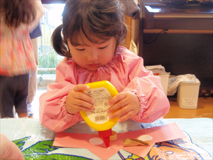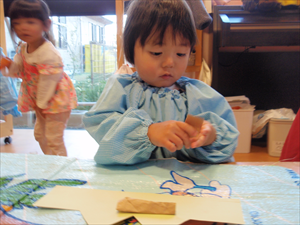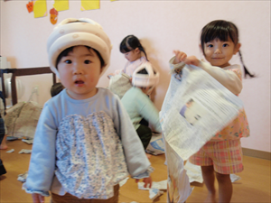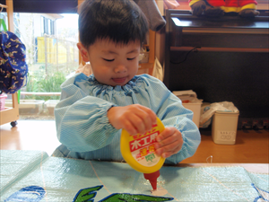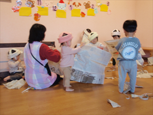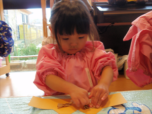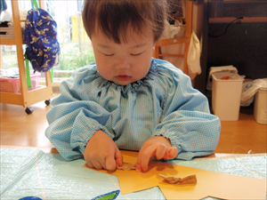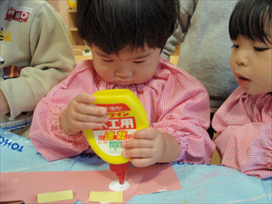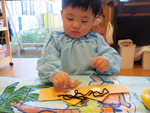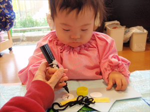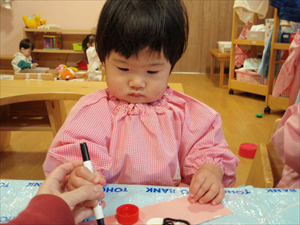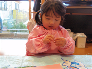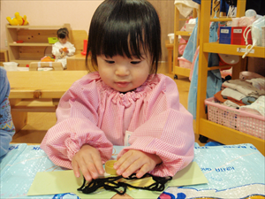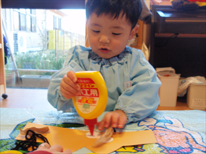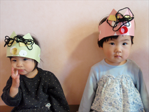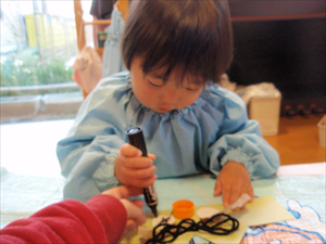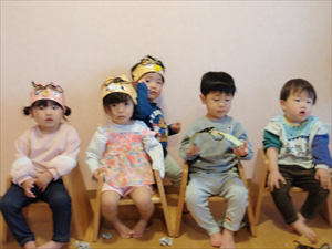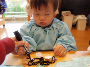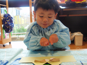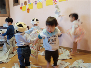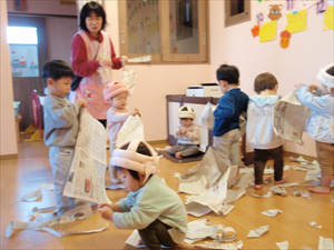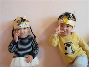 2026/3/4 節分ごっこ(すみれ・ももホーム) 鬼のお面をつくりました。まゆげはこうやってネジネジ。。。 保育者の真似をして集中して取り組みました。ボンドも自分でやりたいとアピールしています。 おめ目を書いて完成です! 新聞紙でお豆を作って節分ごっこを楽しみましたよ(*^_^*) 渡部
