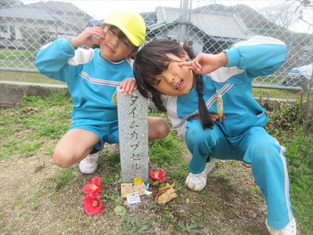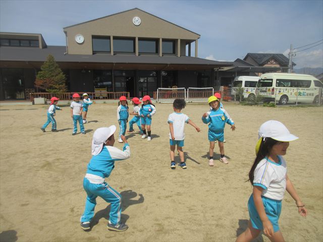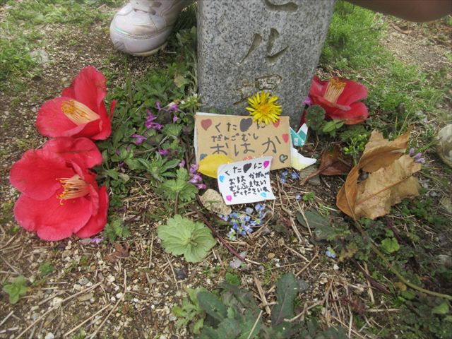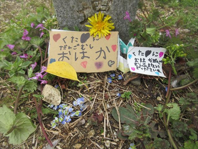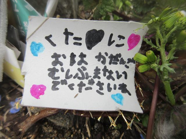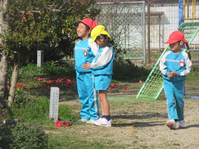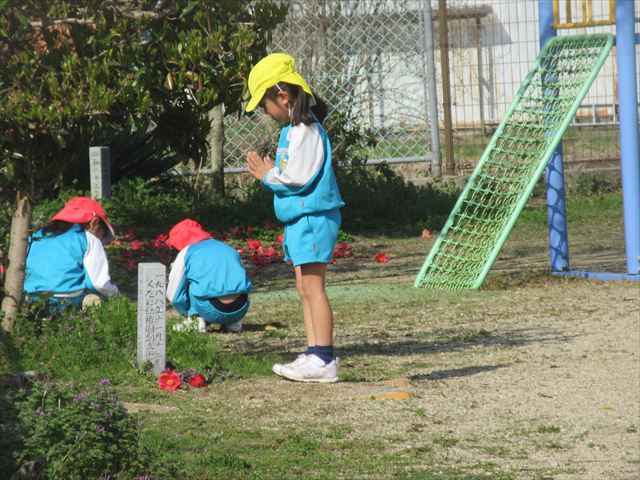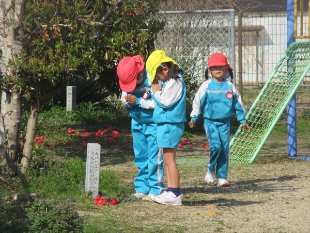 子どもさん達がつくったお墓に行ってみると、それはそれは、愛に溢れたものでした。プレートには「ダンゴムシふまないでね」と書かれ、色とりどりのお花が飾られ、お友達が順に手を合わせる・・・そんな姿を年下のお友達も「何をしてるんだろう」と真似をする・・・・小さな生命(いのち)を大切にしようとする優しくあたたかい心に本当に、幼稚園で経験したたくさんのことが成長につながっていることを感じました!