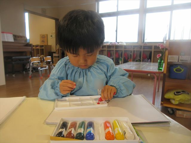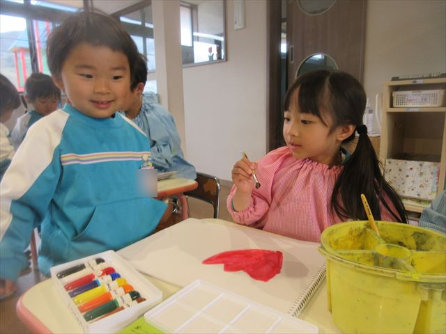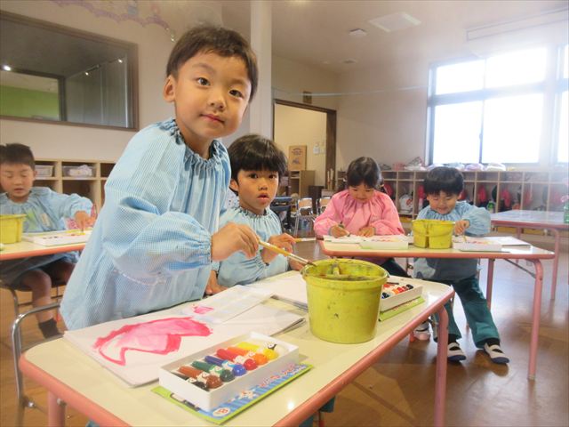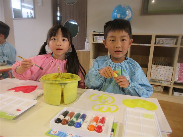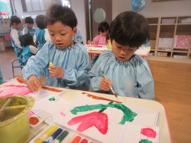 2026/4/7 自分の絵具🎨(ひまわりホーム) はじめての自分の絵具!使うのを楽しみにしていました! 観察したチューリップを一人ひとりが感じたままにじゆうがちょうに表現しました! 混色が楽しくて、「赤と青を混ぜたら何色になるか“実験”してみよう!」と試してみるお友達もいましたよ(#^.^#) ひまわりホーム 鶴原 年少さんも興味深々で見に来てくれましたよ(#^.^#)
