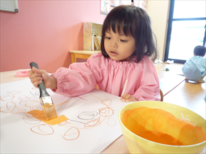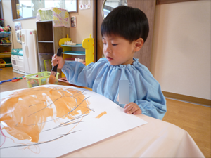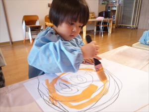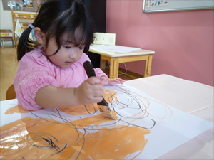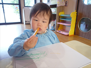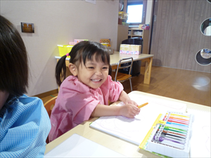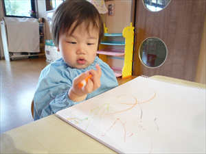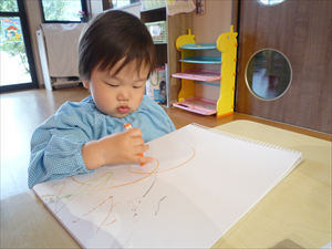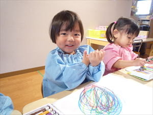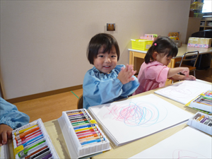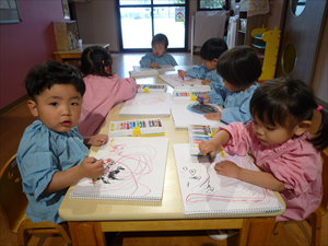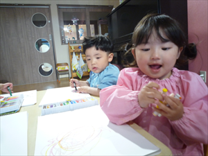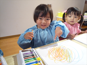 クレヨンでのお絵描きでは、ももホームの時のおゆうぎ会テーマ曲『どんな色が好き』を流してみました。 音楽に合わせてノリノリで歌いながらクレヨンを走らせる子どもさんたち。