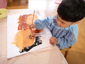 晴れの日はお外で思いっきり、雨の日もお部屋でじっくり。 今、絵の具で何やら大好きなあの人の絵を描いていますよ……。完成をお楽しみに♡