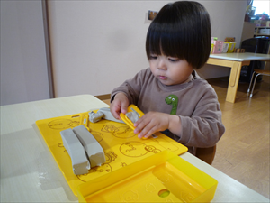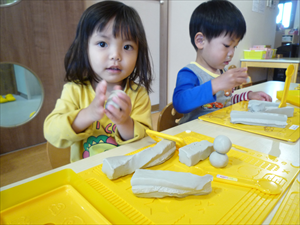 さっそく粘土遊びに挑戦! まだ新しい粘土の固さに苦戦しながらも、一生懸命ちぎって感触を楽しんでいます。道具の使い方もまだ研究中。「この棒は何だろう?」「どうやって使うのかな?」と、自分たちで模索する姿はまるで小さな科学者のようです。